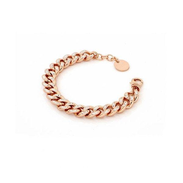 Elegante bracciale di catena grumetta con chiusura a moschettone impreziosito da cristalli. Lunghezza 19 cm. Questo meraviglioso bracciale è uno tra i pezzi più preziosi della collezione Fashion Bronze, luminoso e glam, perfetto in ogni occasione.