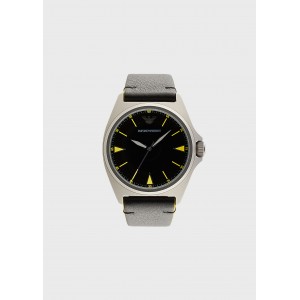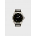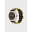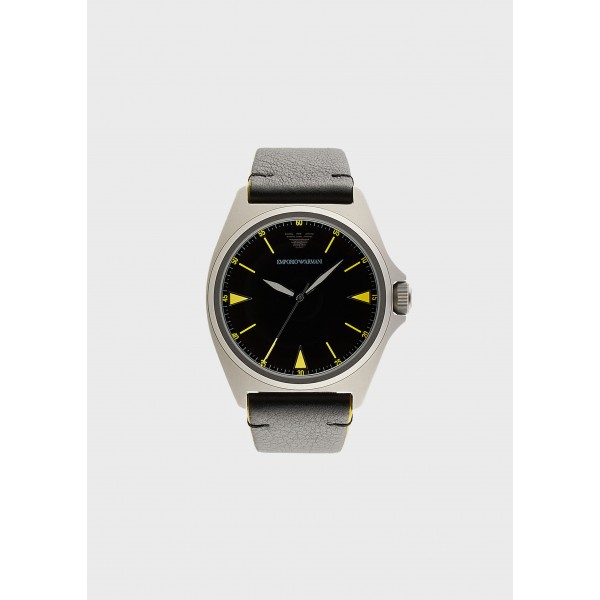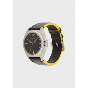 Orologio con cassa da 40 mm, nero con dettagli gialli, movimento al quarzo a tre sfere e cinturino in pelle nera.